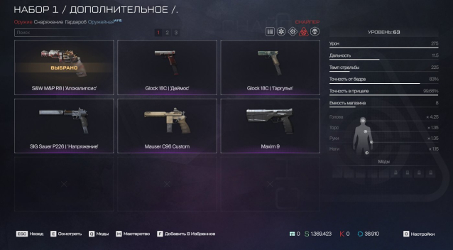 🔫Пистолеты:S&W M&P R8 «Апокалипсис» (63ур.); Mauser C96 Custom (51ур.); Sig Sauer p226 «Напряжение» (34ур.)