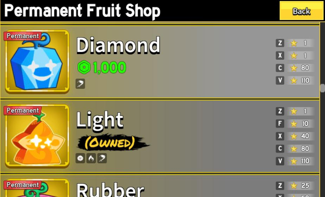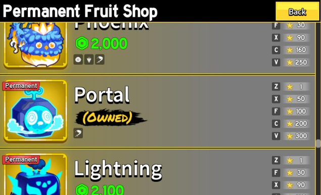 Permanent Fruits: Portal (PERM), Light (PERM), Rocket (PERM).