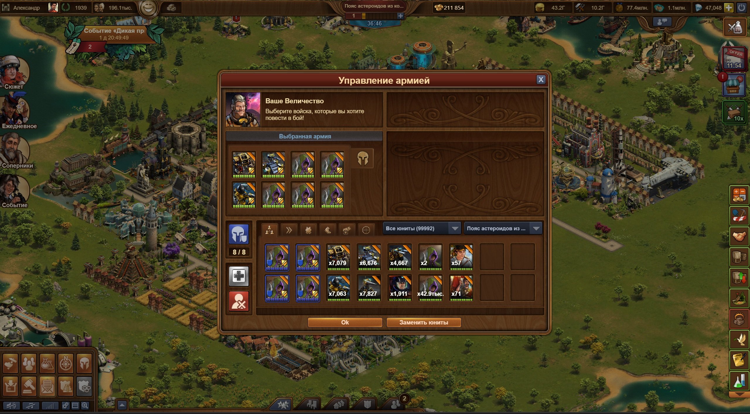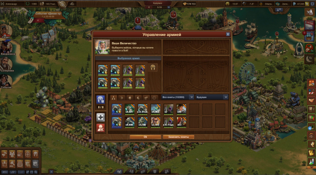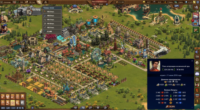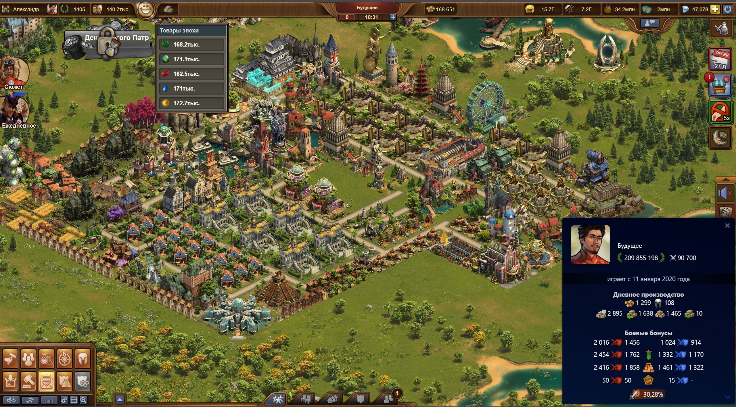 Много товаров предыдущих и текущих эпох, есть немного товаров последующих эпох для плавного перехода в них, много разных плюшек в инвентаре — ивентовых строений для прокачки города на сошки, атаку и защиту и т.д. Можно выкупить за брюлики и медали расширения, увеличить площадь города, поставить новые строения, полученный из ивентов. В обоих мирах много войск текущей эпохи, которыми экспедиция гильдии, все уровни, проходится автобоем. Есть куда расти и развиваться, оба мира готовы к переходу в новую эпоху.