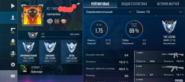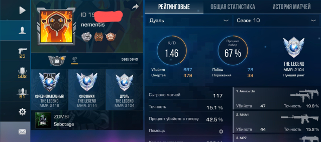 Звание: LegendКраткое описание: 🔥🔥Топ акк с красивым ид (190099991)+ инвентарь с сетом и скинами❄️Legends:10 дуэли, напы, мм🔥🔥
