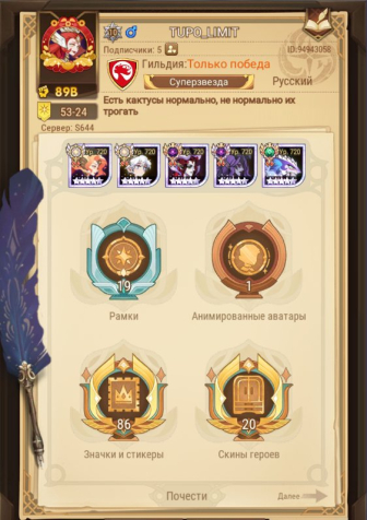 Краткое описание: 📜 53 ГЛАВА ⏫ 400 LVL 🏰 1105 Этаж башни 🤍 105 Возвышенных героев ⚔️ 89B Мощи 📩 С почтой