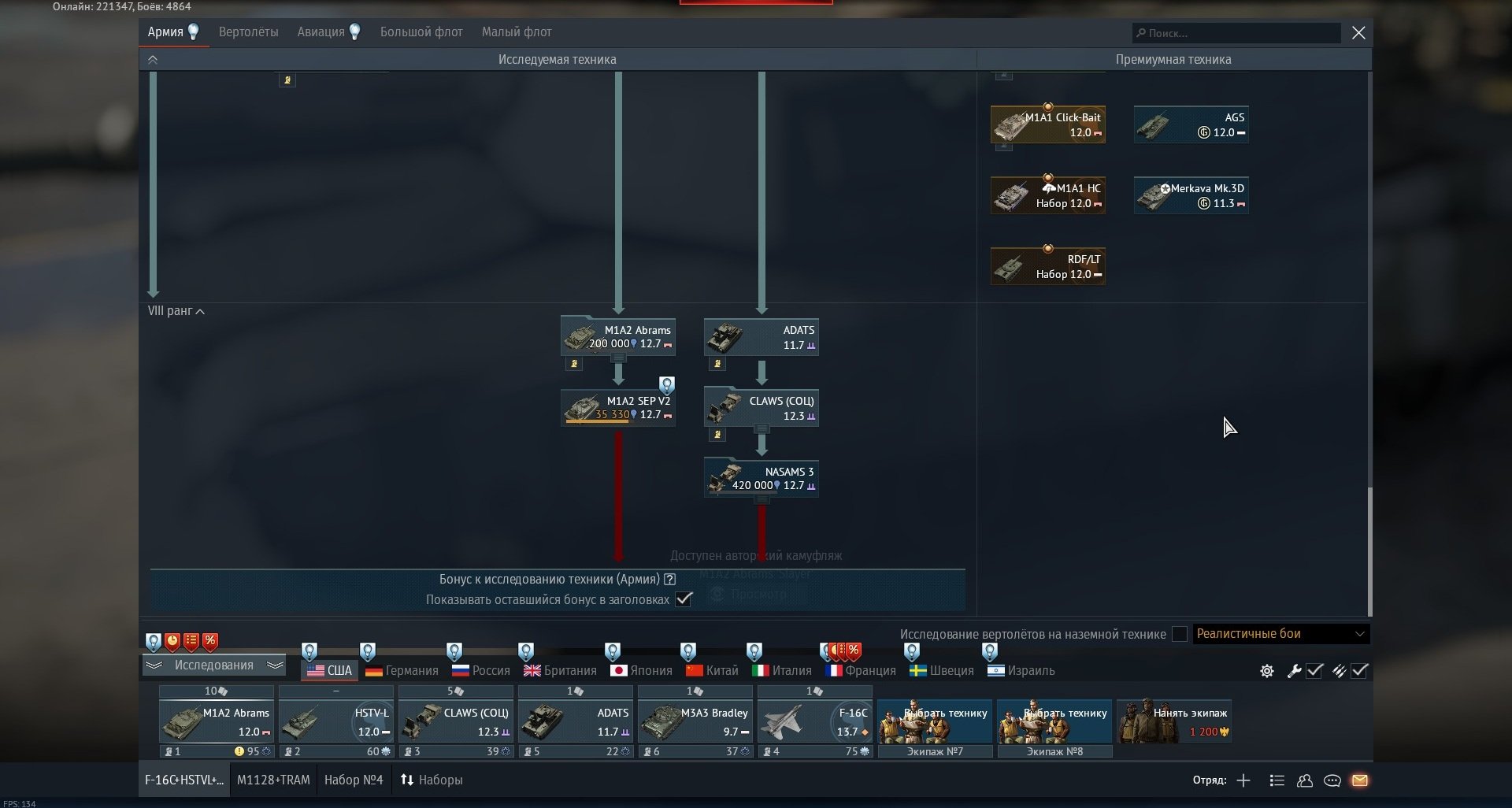🇺🇸 Исследована наземная техника вплоть до 8 ранга. Исследуется NASAMS 3, M1A2 SEPV2 необходимо купить. Поможет докачать M1A1HC Clickbait, HSTV-L. Есть так же M1128 Wolptack. M1A2 выкачан и находится в сетапе.
