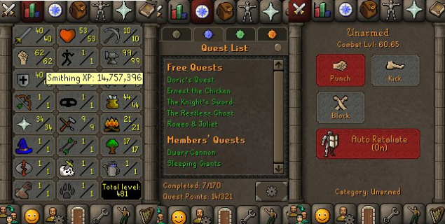 Игра: Old School RuneScapeКраткое описание: TTL 481 CL 60 QP 14 Stats 40 ATT 62 STR 40 DEF 99 Smithing