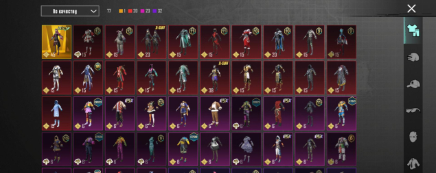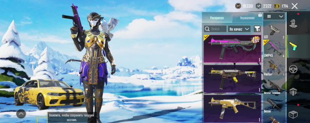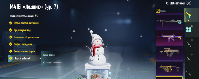 M416 Ледник 7 лвл, UMP45 Юбилей — киллчат/ящик, M416 Разрывающий рев 4 лвл, SCAR-L Мощный бас 2 лвл, Honey Badger Красочное сияние 2 лвл, 15 оружий, остальные — 1 лвл