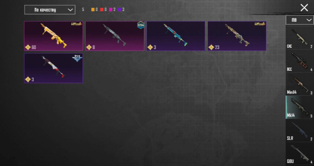На аккаунте имеется 2 прокаченных мк-14, бригада, городской ходок, ананасик