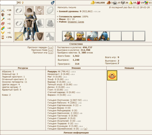 Сервер: HeroesWM.ruКраткое описание: 9 Уровень, Рыцарь, 550к Голды, Ресурсы