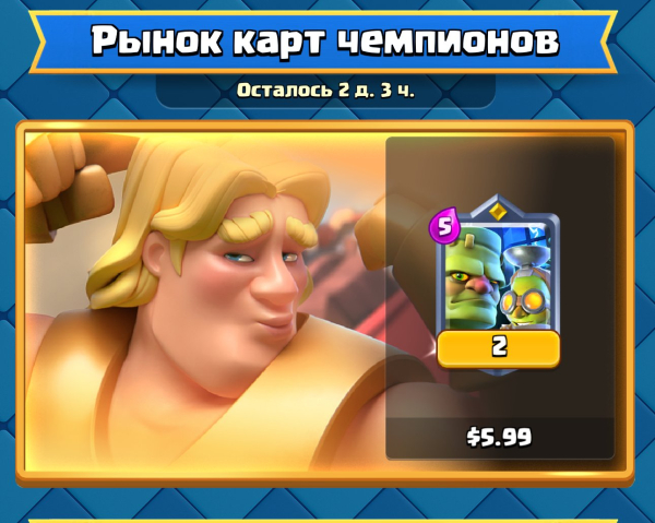 Тип предложения: Чемпионские картыСпособ пополнения: С заходом в игру (Supercell ID)