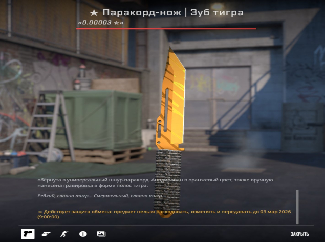 Подробное описание: ★ Paracord Knife | Tiger Tooth (Factory New) Float 0.000034062топ 3 TOP 3!!!