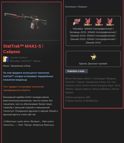 StatTrak™ M4A1-S Сайрекс , с редкими наклейками 3DMAX (голографическая) | Катовице-2015 , и брелком, Продажа, Винтовка, M4A1-S, Тайное, Закаленное в б