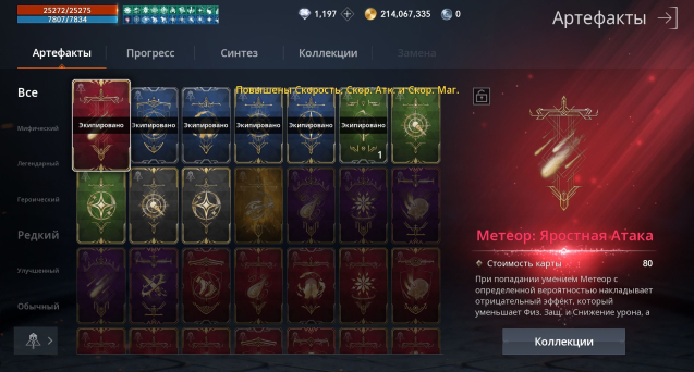 📜 Артефакты: 1 шт. красный (Метеор Яростаная атака — в класс), 4 шт. синих в класс.