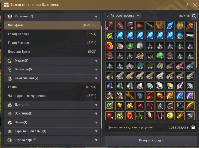 — Основной склад Кальфеона- Развиты рабочие 400 лямов в день. 400 влияния. 700 свитков удачи.