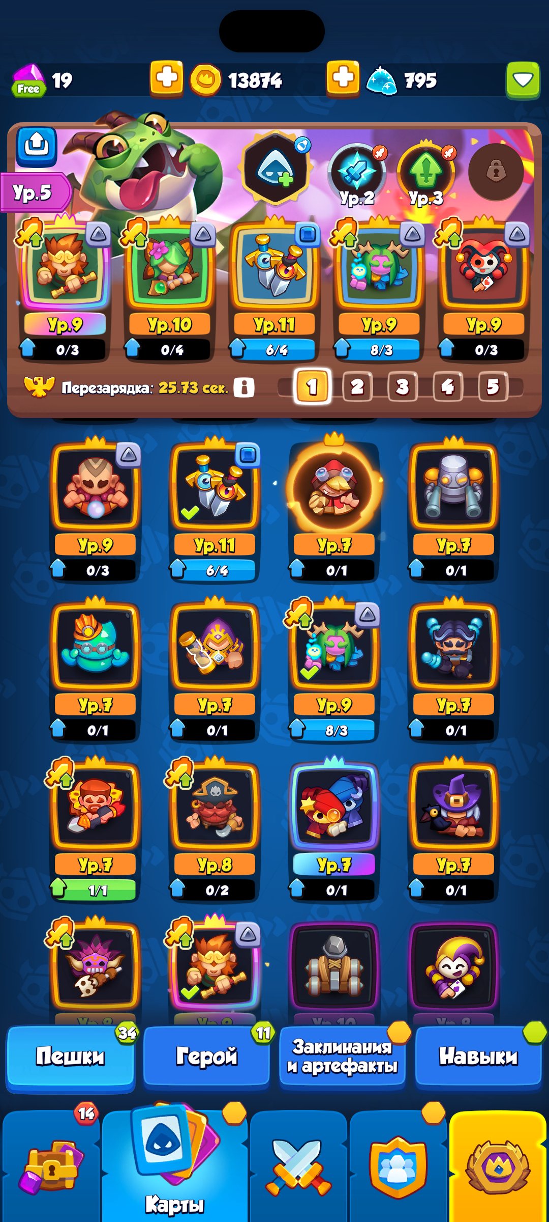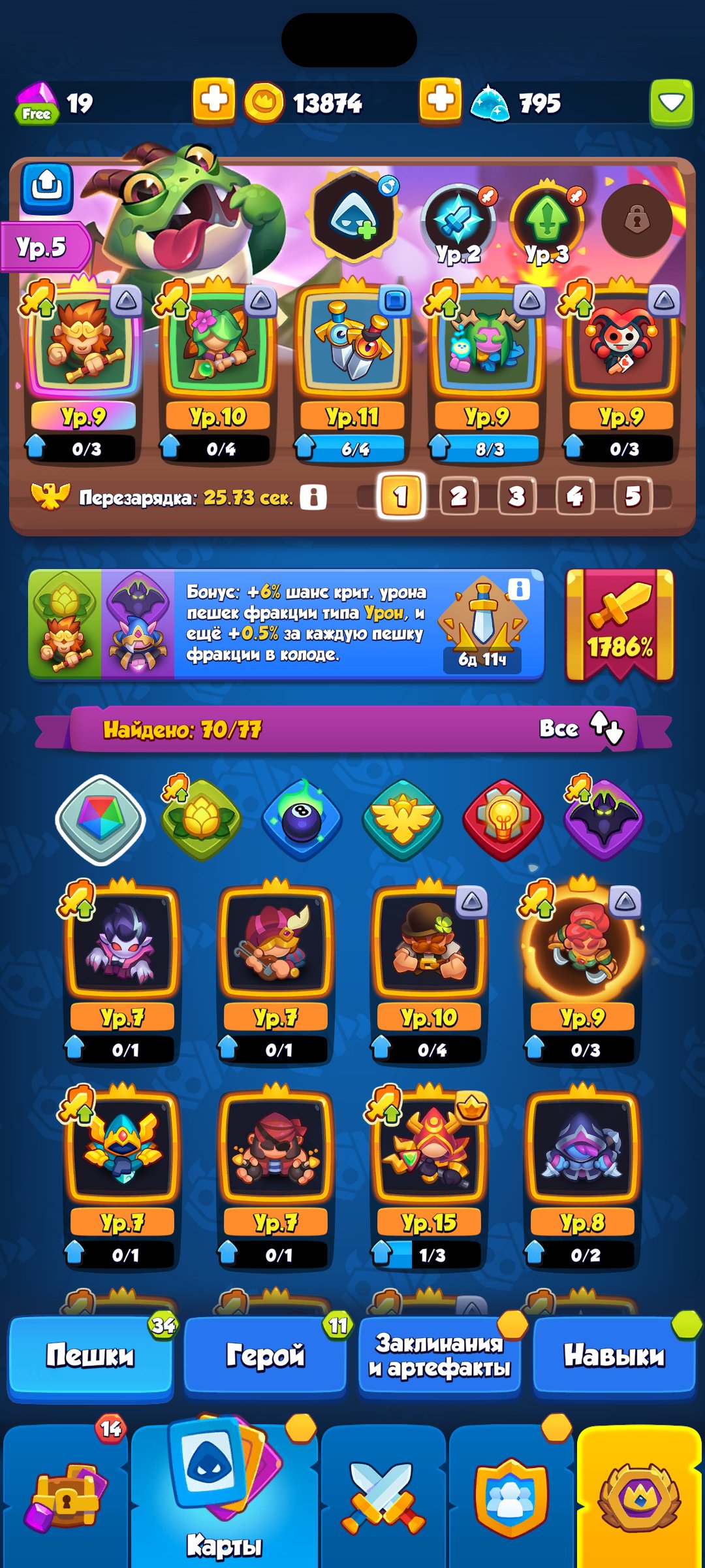 Краткое описание: 1700+ Крита, 15 культистПодробное описание: Хороший аккаунт под основу более 2к критов, есть все карты, среди которых 15 культист, 11 мечи, и призыватель 9 с возможностью качнуть на 11, и новая пешка уже 9 уровня! Успей купить по низкой цене!