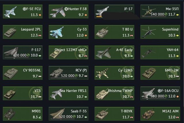 На аккаунте почти 1 000 единиц техники. На огромном количестве техники куплены эксперты (даже на топовой технике) Техника за полковые очки (Leopard 2 PL, M1A1 AIM, Т-80УК, T-80U, VT-5, Brishma TWMP, БМП-2М, Object 122MT «MC», Magach 6B Gal, CV 9035NL, М901, YAH-64, Superhind, СУ-33, F-5E-FCU, СУ-22М3, Sea Harrier FRS.1, Hunter F.58, A-4 Early, Me 262 A-1a/U1, СКР-7)