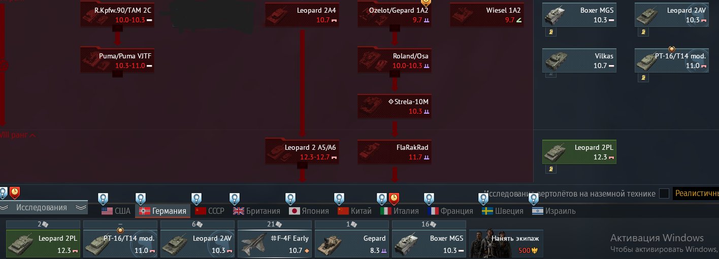 Германия: 1) наземка 9.0. Прем/акционная техника: PT-16/T14 mod (талисман), Leopard 2 AV, Vilkas, Boxer MGS, Sd.Kfz.234/2 TD, Sd.Kfz.251/22, Pz.Kfz, Churchill, Pz.II C(DAC), Штурмтигр, Maus