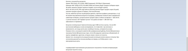 На момент выставления аккаунта на продажу, суммарная стоимость всех предметов в инвентаре на бирже, которые можно продать здесь и сейчас составляет +- 160-170 ГК. С учетом техники с БП «Бравый лучник» эта сумма составит +- 200-250 ГК (в зависимости от времени). ГК можно потратить на покупку пакетной техники, премиум-аккаунта, голды и т.д.