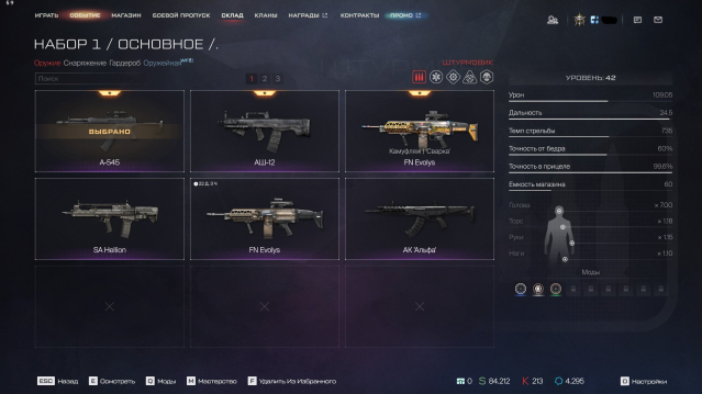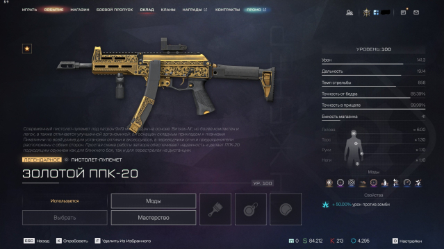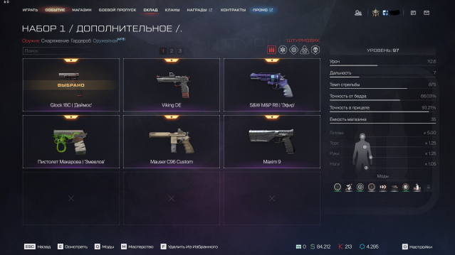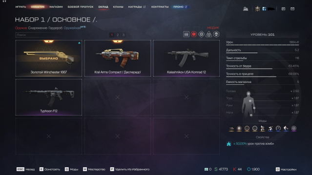 Золотой ППК-20(вкачан 100 лвл, на легендарных модах), Золотой Winchester 1887(100лвл,+вкачаны многие элитные моды для полноценного нагиба + легендарные), А-545(40лвл), АШ-12,Kral Arms Compact, PGM Ultima Ratio 'Стрит-арт',FN Evolys(40лвл). Пест — Максим 9 (100лвл,9модов), Глок(100лвл,9модов), новый ибма пест Viking DE. ✅