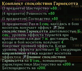Раз в 1 сек. находясь в бою носитель получает эффект Эхо спокойствия Гарнекотта длительностью 15 сек., уровень эффекта теряется при преодолении каждых 7 м. дистанции. При входе в бой носитель получает 4 бонусных уровней эффекта. Когда уровень эффекта достигает 12, следующая направленная атака наделит носителя эффектом Влияние спокойствия Гарнекотта на 8 сек., повышающим характеристики Мастерство на +200 и Беспощадность на +200.