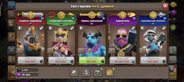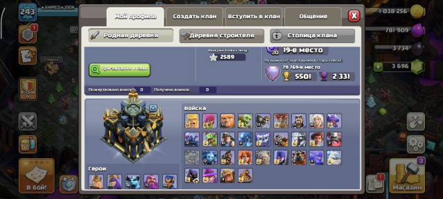 Уровень Ратуши: 17Краткое описание: ⚡️17𝐓𝐇【243𝐋𝐕𝐋】⚡️💎12 ЭПИК СНАРЯГ💎🔵【ГЕРОИ 100/100/75/50】🔵 💙3.7К ГЕМ + ОФОРМА💙🍀ПЕРЕПРИВЯЗКА🍀