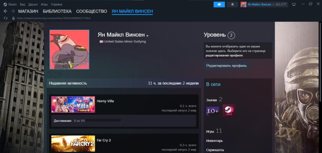 аккаунт мой всё чисто, на нём второй уровень, есть два значка итоги 2025 и то что на нем куплено 10 игр.