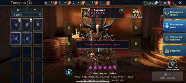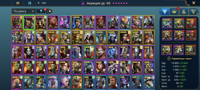 Подробное описание: Продам аккаунт с лучшей легой в игре — Акриция (фулл навыки и таланты). Много энергии, фарм 20 дракона, паучихи. Так же много очень полезных эпиков, эпики для анкила. Подробности на скринах.Адская компания не пройдена.