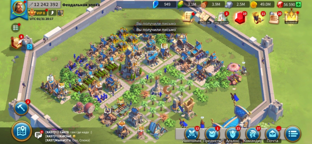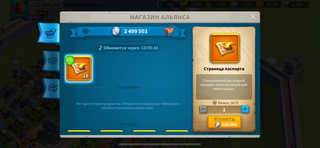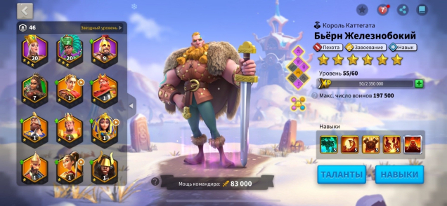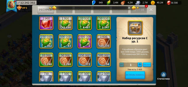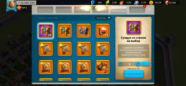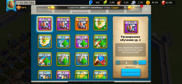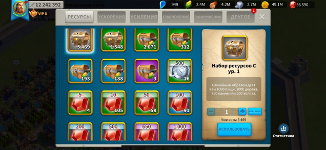 VIP 8. Мощь 12.2 млн. гемы 56к. ресурсов полно. Так же много усилений и ускорений и снаряжения