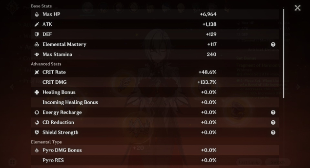 Герои — Арлекино С3, Фурина С0, Навия С0. Джинн С0. Мона С0, Дилюк С0
