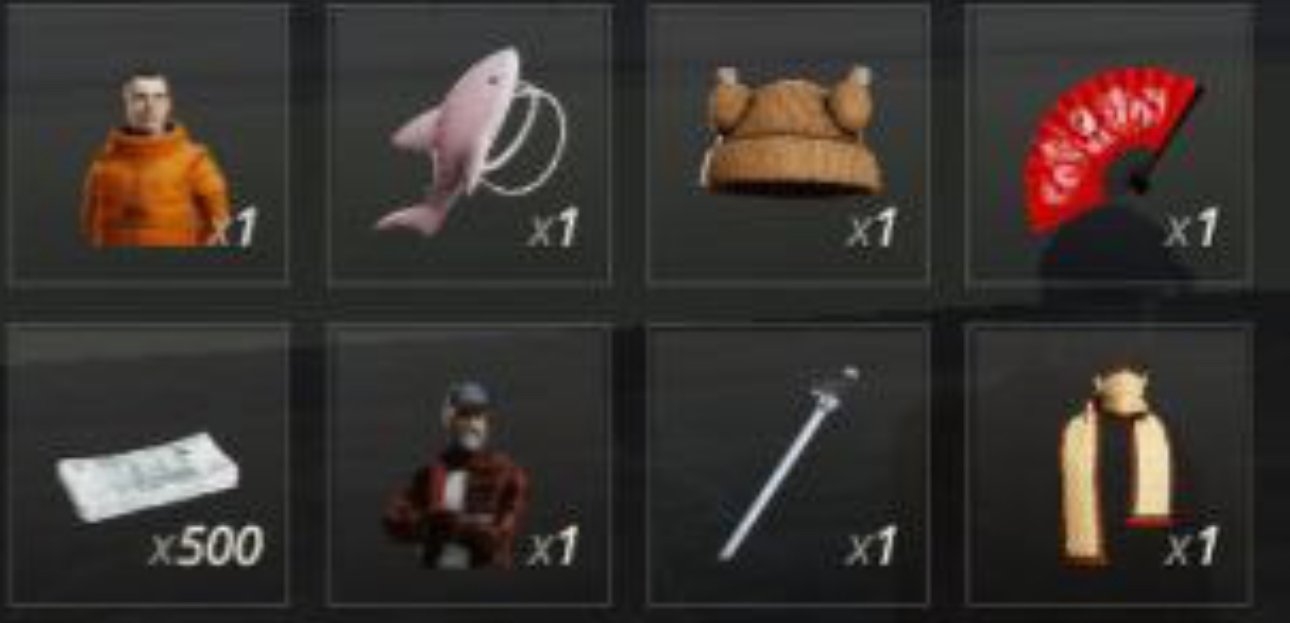 • Инвентарь:🫐♥️Скин «Оранжевый Костюм», Рюкзак «Акула», Аксессуар на голову «Шляпа chicken», аксессуар в руку «Красный Веер», Аксессуар на спину «Меч», Аксессуар на голову «Шарф Гуччи»🫐♥️
