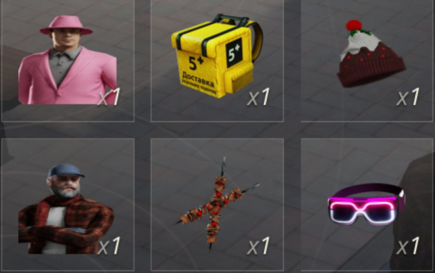 • Инвентарь:🫐♥️Скин «Розовый Мафиози», Рюкзак «Курьерский», Аксессуар на голову «Шапка Пирожное», Аксессуар на спину «Шашлык», Аксессуар на лицо «Неоновые Очки»🫐♥️