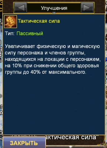 Подробное описание: Увеличивает физическую и магическую силу персонажа и членов группы, находящихся на локации с персонажем, на 10% при снижении общего здоровья группы до 40% от максимального.