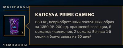 💥На аккаунт были получены 3 Капсулы Prime Gaming. Чтобы получить 1950 RP + 3 Случайных скина ценой 1350 RP — Вам будет необходимо открыть данные 3 Капсулы в инвентаре аккаунта.