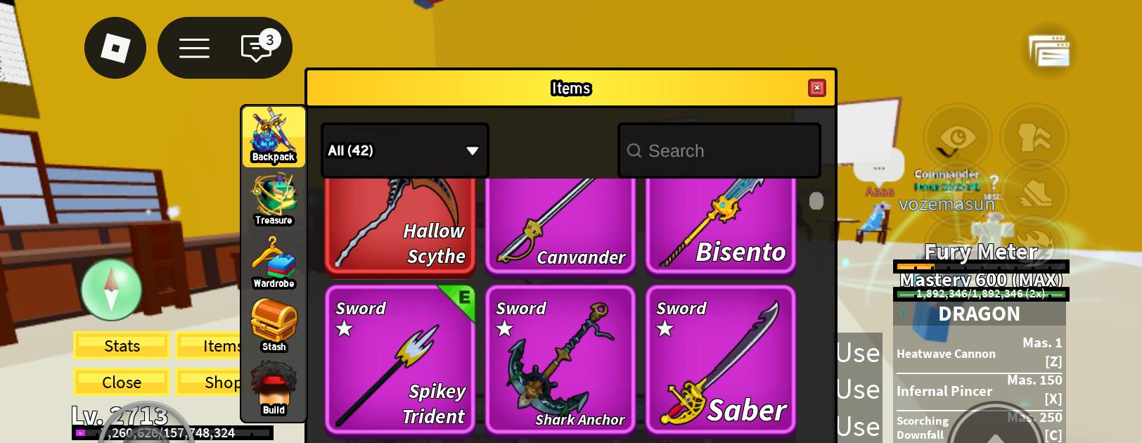 --> Blox Fruits: 2707 LVL, все стили боя, Мечи — Hallow Scythe, 5 Легендарных мечей, 6 Легендарных мечей*, 3 Эпических меча*, 3 Эпических меча. Оружие — 2 Легендарных оружия, 4 Эпических оружий, 1 Эпическое оружие*. Акксесуары — 9 Лег акксесуаров, 24 Эпик акксесуаров. Aura — 1 Легендарная, Kitstune, Rainbow saviour, 10 эпических. Донат — x2 Mastery, x2 Money, x2 Boss drop, Fast Boats, x4 Слот под фрукты. perm — Rocket, spin, Blade, Magma, Buddha, Portal, Dough, Dragon
