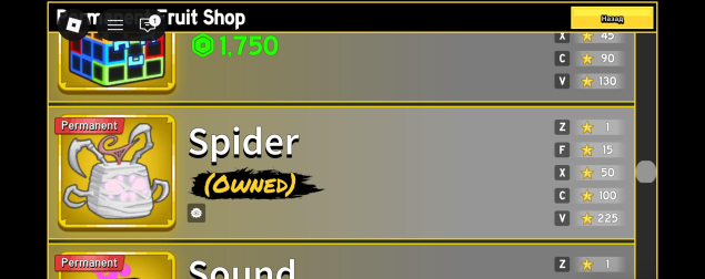 В blox fruits есть пермамент Спайдер, бомба, рокет, 2 скина на бомбу и 1 на eagle, 2x деньги и мастерство, +1 fruit storage, 2 фрукта газ и 1 тесто