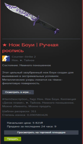 Краткое описание: ✅ 【★ Нож Боуи | Ручная роспись】✅ Немного поношенное MW ✅ 10 500р в стиме ✅