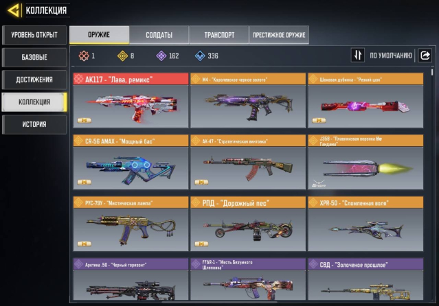 🎯 ОРУЖИЯ: 1 МИФИК; 8 ЛЕГЕНДАРНЫЕ; 162 ЭПИК, 336 РЕДКИЙ