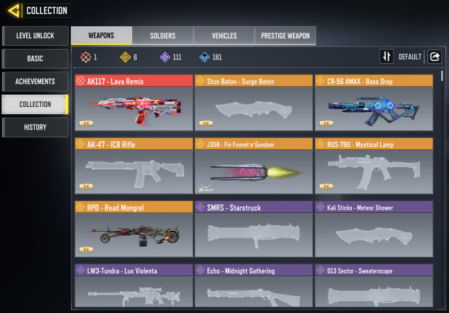 ◘ 🎯 Скины (на оружие): 1 мифических, 5 легендарных, 111 эпических, 181 редких