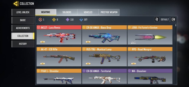 ◘ 🎯 Скины (на оружие): 1 мифических, 6 легендарных, 110 эпических, 197 редких