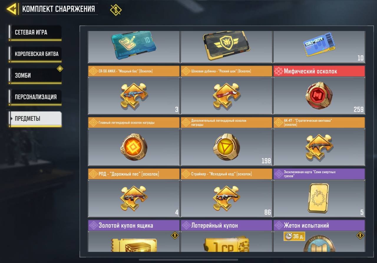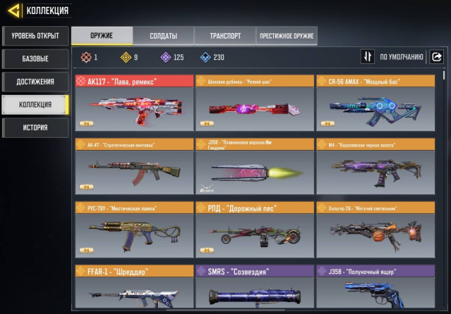 ✅️ ОРУЖИЕ; 1 МИФИЧЕСКОЕ; 9 ЛЕГЕНДАРНОЕ; 125 ЭПИК, 230 РЕДКИЙ🔫
