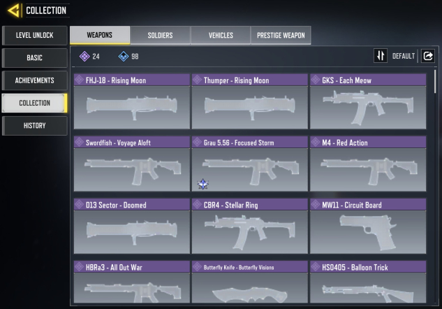 ◘ 🎯 Скины (на оружие): 24 эпических, 98 редких