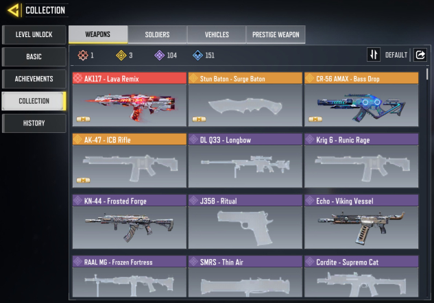 ◘ 🎯 Скины (на оружие): 1 мифических, 3 легендарных, 104 эпических, 151 редких