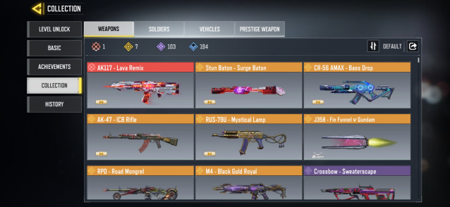 ◘ 🎯 Скины (на оружие): 1 мифическое, 7 легендарных, 103 эпических, 194 редких