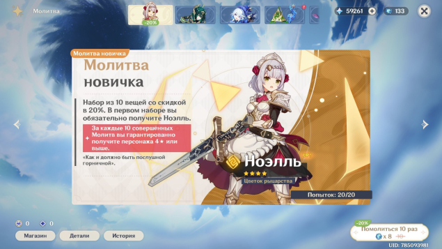 ◼ 600-800 круток — общее число круток, высчитывается по данной формуле — Примогемы + Стандарт молитвы + Ивент молитвы + Скидка новичка + Крутки в магазине пайман за Звездный блеск + звездную пыль = 600-800 круток в сумме