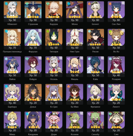 Подробное описание: ✔️Нёвиллет✔️ Странник✔️ Кадзуха✔️ Мона✔️ Тигнари✔️ Ризли✔️ Дэхья✔️ Кэ Цин
