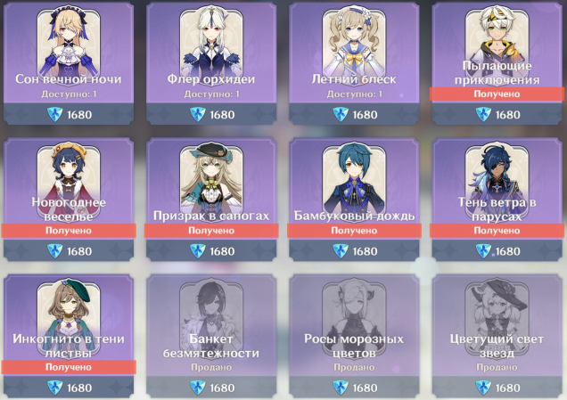 Куплены скины на Е Лань, Шэнь Хэ и Кли, а также получены ивентовые скины на Беннета, Сян Лин, Кирару, Син Цю, Кэйю и Лизу.