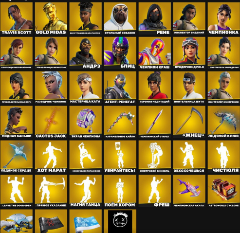 🔥 Огромное количество покупных скинов из магазина (Item Shop), кирок, танцев и оберток.