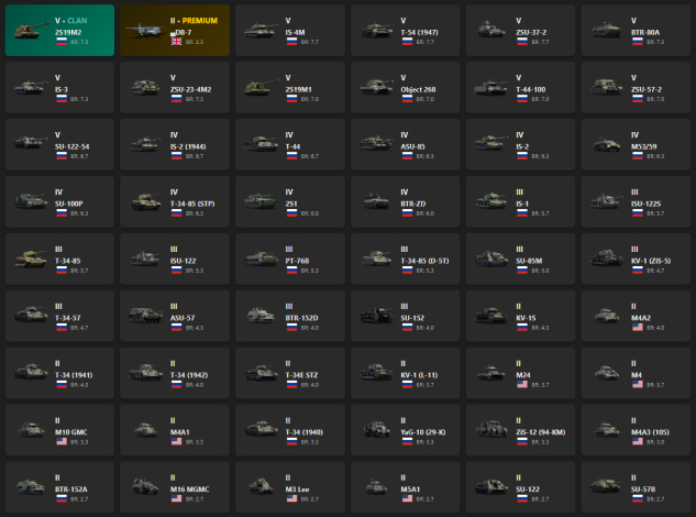 V - 12 2S19M2, DB-7, IS-4M, T-54 (1947), ZSU-37-2, BTR-80A, IS-3, ZSU-23-4M2, 2S19M1, Object 268, T-44-100