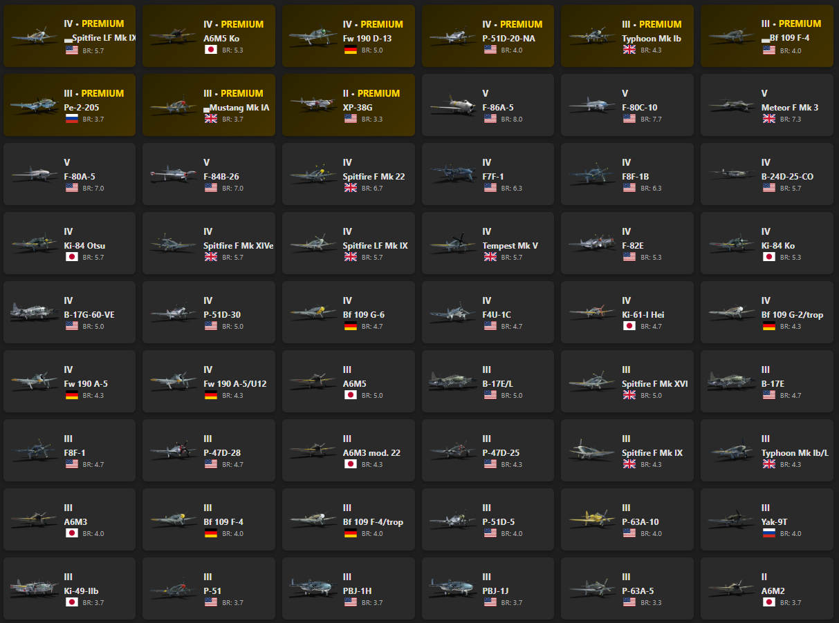 V - 5 Spitfire LF Mk IXc, A6M5 Ko, Fw 190 D-13, P-51D-20-NA, Typhoon Mk Ib, Bf 109 F-4, Pe-2-205, Mustang Mk IA, XP-38G