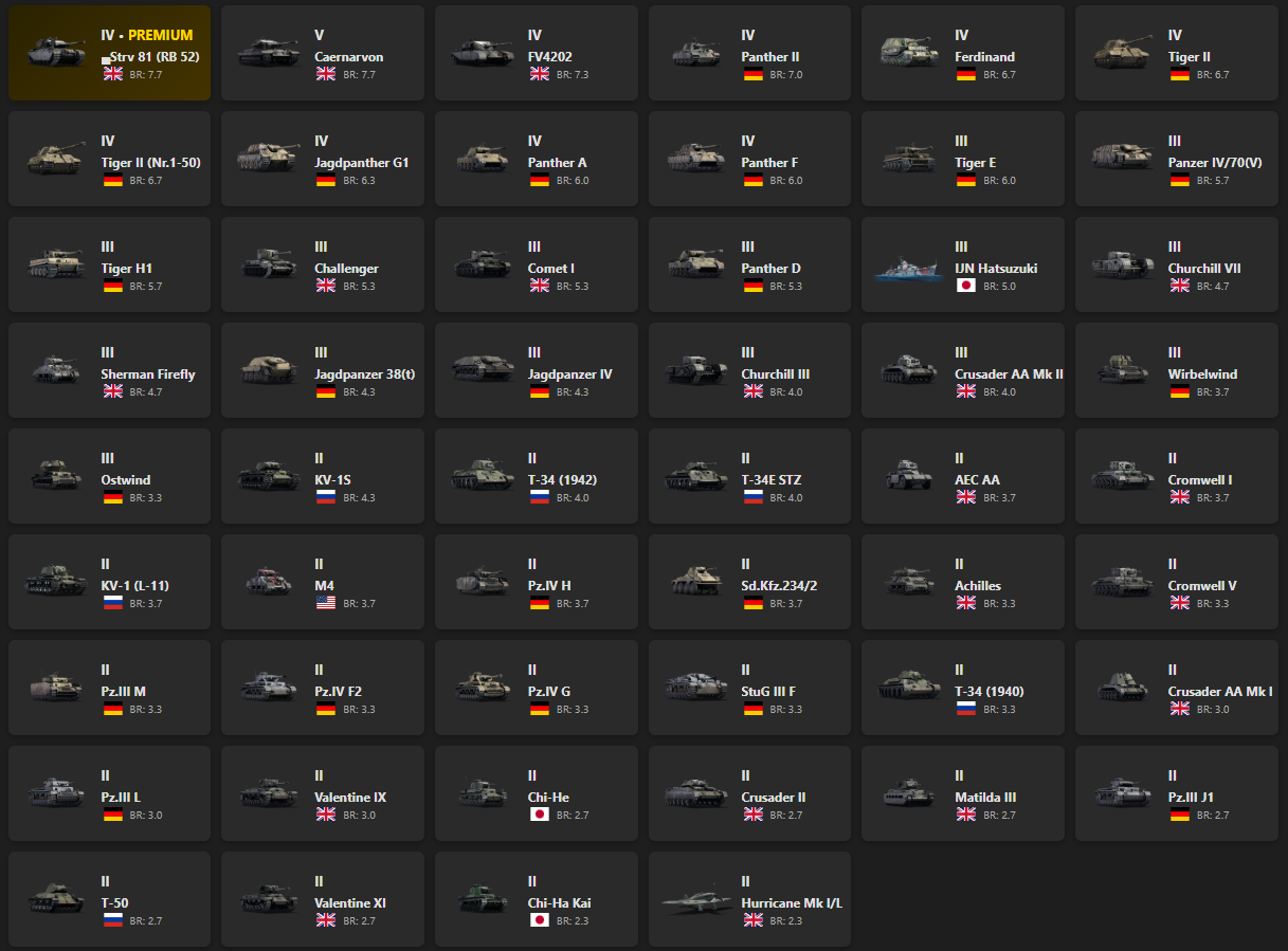 V - 1 Strv 81 (RB 52), Caernarvon, FV4202, Panther II, Ferdinand, Tiger II, Tiger II (Nr.1-50), Jagdpanther G1, Panther F