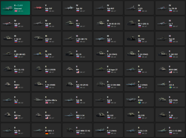 V - 1 Firecrest, Yak-15P, Yak-3U, Yak-9UT, I-225, La-7B-20, Yak-3P, Yak-9P, IS-1, T-34-85 (D-5T), KV-1 (ZiS-5), La-7