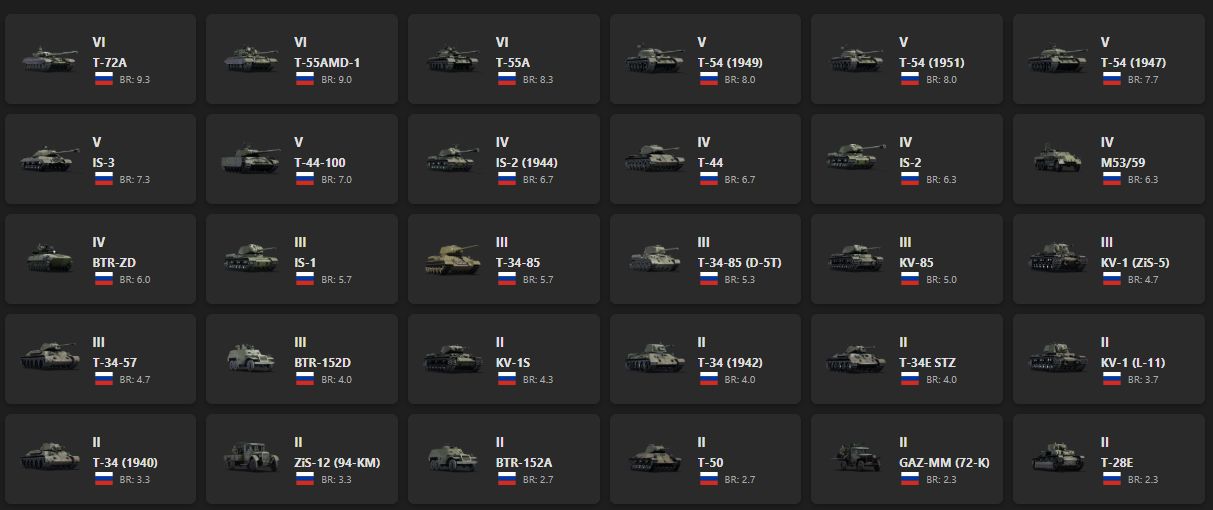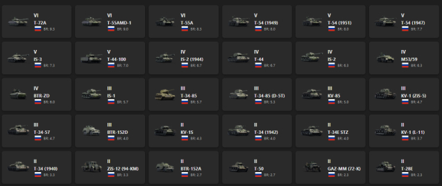 VI - 3, V - 5 T-72A, T-55AMD-1, T-55A, T-54 (1949), T-54 (1951), T-54 (1947), IS-3, T-44-100, M53/59, BTR-ZD