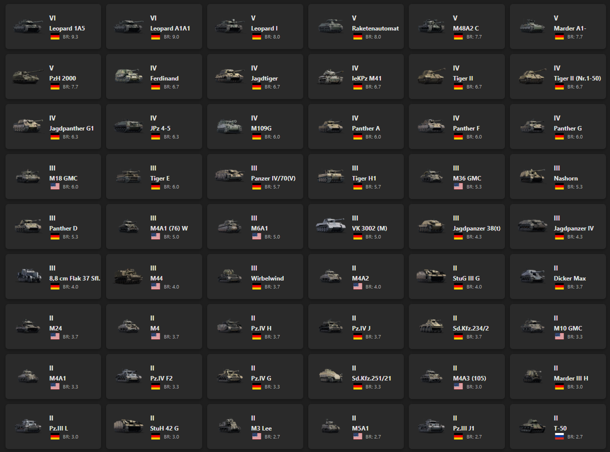 VI - 2, V - 5 Leopard 1A5, Leopard A1A1, Leopard I, Raketenautomat, M48A2 C, Marder A1-, PzH 2000, Jagdtiger